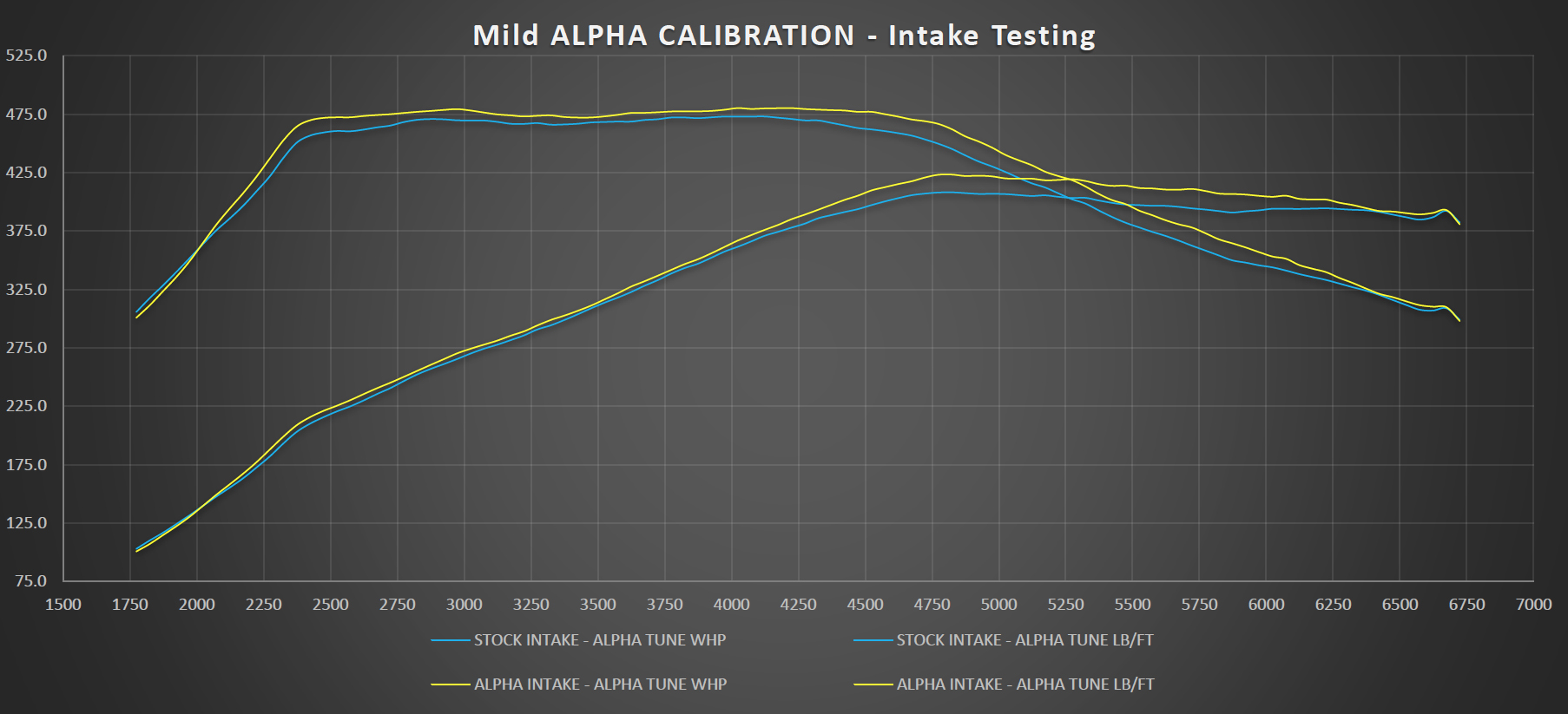- +17 Wheel Horsepower Gain: Achieved with Red Alpha Cold Air Intakes and Alpha Tune, compared to stock intakes and tune, based on average of multiple runs.